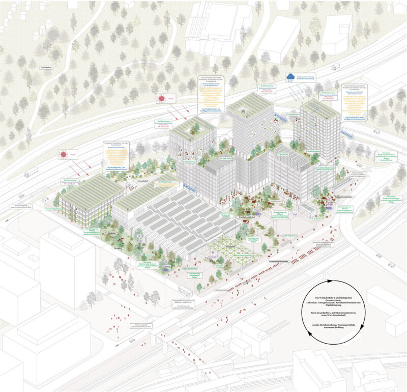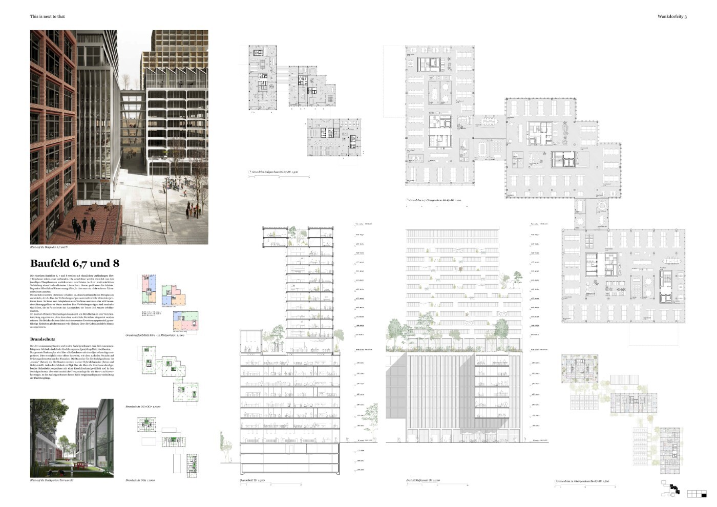 Sorgfältig und behutsam wird in einer einführenden Auseinandersetzung die Vielfalt des Richtprojektes analysiert und in den Kontext der Geschichte des Städtebaus und eigener Erfahrungen gebracht. Die Überlagerung unterschiedlichster Nutzungen, bei sehr hoher räumlicher Dichte, wird als Herausforderung verstanden, um bekannte und herkömmliche städtebauliche und architektonische Typologien zu hinterfragen und vom Richtprojekt zu lernen. Die unterschiedlichsten Bilder und Modelleindrücke des Richtprojektes liessen sich zwar mit bekannten Assoziationen in Verbindung setzen, gesamthaft aber beziehen sie sich nur bedingt aufeinander, so eine der Erkenntnisse. Cedric Price’s «Fun Palace» und René Burri’s «men of a rooftop» stehen für einen inhaltlichen wie visuellen Zugang zur neuartigen, kaum durch Referenzen erprobten, hochverdichteten Stadt. «Wie produziert man solche Räume, welchen Prinzipien folgen sie?» Zwecks erstrebenswerter Synergien, Effizienz und Wirtschaftlichkeit wird zur Erkennung der wesentlichsten Charakteristiken von Wankdorfcity 3 ein klärendes, programmatisches Regelwerk von den Verfassenden entworfen. Die eigenständige Lektüre lässt einen kritisch-konstruktiven Zugang zu den Thesen und den städtebaulich-architektonischen Leitgedanken des Richtprojektes erkennen, welche in den bearbeiteten Bereichen Perspektiven eröffnen. Mit leichten Abweichungen wird am geometrischen Gerüst/Volumetrie festgehalten. Im Erdgeschoss konzentrieren sich nachvollziehbar die Eingänge und die gebündelten Gastronomienutzungen zum Neuenschwanderplatz hin, mit der nachteiligen Folge, dass die Flächen stärker unterteilt werden. Alle vertikalen Erschliessungen, auch die der Wohnungen, werden innerhalb der Volumen geführt. Nicht nur die Erschliessung der Wohnungen erfolgt dadurch ohne soziale Interaktion, auch die Möglichkeit einer wahrnehmbaren Zugänglichkeit der Stadtterrasse auf 30 m, kann damit nicht angeboten werden. Die Entscheidung zu kompakten Volumen mit inneren Erschliessungen kann nachvollzogen werden.