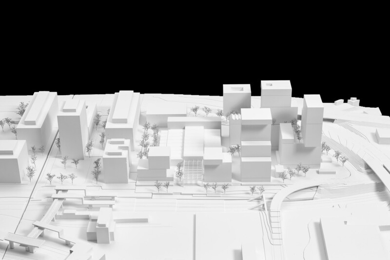 Dennoch stellt sich die Frage nach der städtebaulichen Konsequenz bei Anwendung in allen drei Hochhäusern. Die Reduktion der «gestapelten Stadt» auf die grossen Volumina droht so an Prägnanz zu verlieren. Insbesondere die abgeschnitten wirkende, gleichförmige Ausbildung der Kronen steht in einem gewissen Widerspruch zur These «Kronen ausbilden» der Verfassenden. Die Wichtigkeit der kleinmassstäblichen Pavillons im Kontext der aufragenden Häuser wird unterstrichen. Dennoch wird ihre Bedeutung für den Stadtboden durch die fast ausschliessliche Nutzung als Velohallen nicht ausgeschöpft. Die Stadtgarten-Terrasse überzeugt durch die Vielfalt der daran partizipierenden Nutzungen. Homeoffice Studios, Tiny Häuser, Fitnessräume, Kita, Gästeappartements versprechen eine hohe Durchmischung und Belebung der Stadtterrasse.